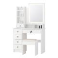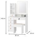 Dotato di cinque cassetti laterali, un ampio cassetto centrale con serratura e mensole aperte per esporre profumi e accessori, garantisce ordine e funzionalità in ogni momento. Lo sgabello imbottito incluso completa la postazione, assicurando comfort durante la routine di trucco o skincare quotidiana.Caratteristiche principali: