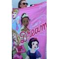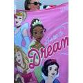 Coperta in pile Disney Princess 100x140 cm, perfetta per accompagnare sogni dolci e momenti di relax. Il design ufficiale Disney raffigura alcune delle Principesse più amate – tra cui Cenerentola, Tiana, Aurora e Biancaneve – su sfondo rosa con la scritta “Dare to Dream”, che invita a credere nei propri sogni. Morbida, leggera e super confortevole, è ideale per lettino, divano, viaggio in auto o come copertina da nanna.