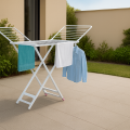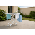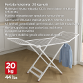 La base è dotata di ruotine integrate che sfiorano il pavimento quando lo stendino viene sollevato da un lato, consentendo di spostarlo facilmente senza sollevare tutto il peso. Le ali laterali garantiscono un’ampia superficie di stenditura, perfette per capi lunghi.