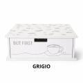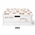 Il coperchio superiore decorato con chicchi di caffè dona un tocco raffinato e rende il prodotto non solo utile, ma anche decorativo. La scritta “But First” con l’illustrazione della tazzina richiama l’atmosfera del rito del caffè, rendendo questo organizer perfetto da lasciare a vista accanto alla macchinetta.