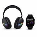 La scatola include cuffie wireless over-ear con illuminazione LED RGB dal design moderno e smartwatch multifunzione con display HD touch ad alta definizione.
