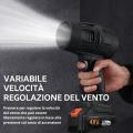 Il Miniturbo Soffiatore a Batteria è uno strumento compatto ma estremamente potente, progettato per offrire massime prestazioni in un formato maneggevole e senza fili. il kit comprende 2 batterie al Litio, e il cavo di ricarica. Grazie alla batteria al litio da 48V, garantisce un flusso d’aria intenso e costante, ideale per operazioni di pulizia rapide ed efficaci. La regolazione continua della velocità del vento permette di modulare la potenza in base alle esigenze, assicurando precisione e controllo in ogni utilizzo. L’impugnatura ergonomica antiscivolo e il grilletto a pressione rendono l’uso semplice e confortevole anche per sessioni prolungate. È perfetto per eliminare polvere, foglie, sporco, residui e detriti da superfici difficili da raggiungere, come garage, balconi, officine, interni auto, attrezzature da lavoro, elettronica e spazi esterni. Il design robusto e compatto facilita il trasporto e lo stoccaggio, rendendolo sempre pronto all’uso. Affidabile, versatile e potente, il Miniturbo Soffiatore a Batteria è la scelta ideale per chi cerca prestazioni professionali in un formato portatile, con tutta la comodità della tecnologia cordless. Uno strumento indispensabile per velocizzare le pulizie quotidiane e migliorare l’efficienza del lavoro.